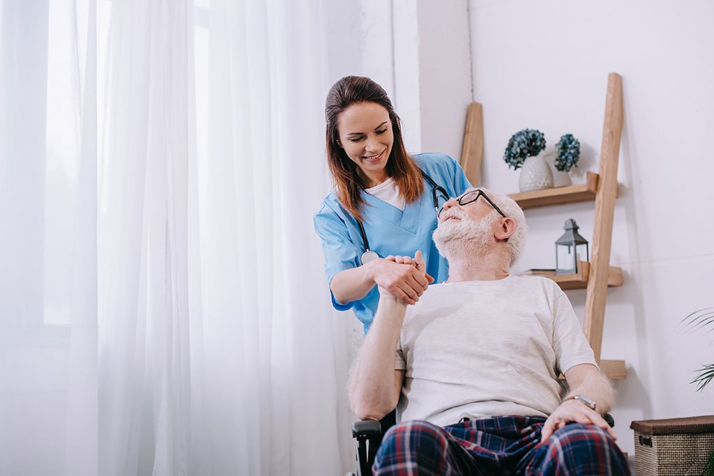 Young man supporting a woman in a wheelchair indoors, showing care and companionship.